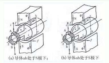 如上圖(a)所示,則有直流電流從電刷A流入,經(jīng)過線圈abcd,從電刷B流出,根據(jù)電磁力定律,載流導體ab和cd收到電磁力的作用,其方向可由左手定則判定,兩段導體受到的力形成了一個轉矩,使得轉子逆時針轉動。如果轉子轉到如上圖(b)所示的位置,電刷A和換向片2接觸,電刷B和換向片1接觸,直流電流從電刷A流入,在線圈中的流動方向是dcba,從電刷B流出。